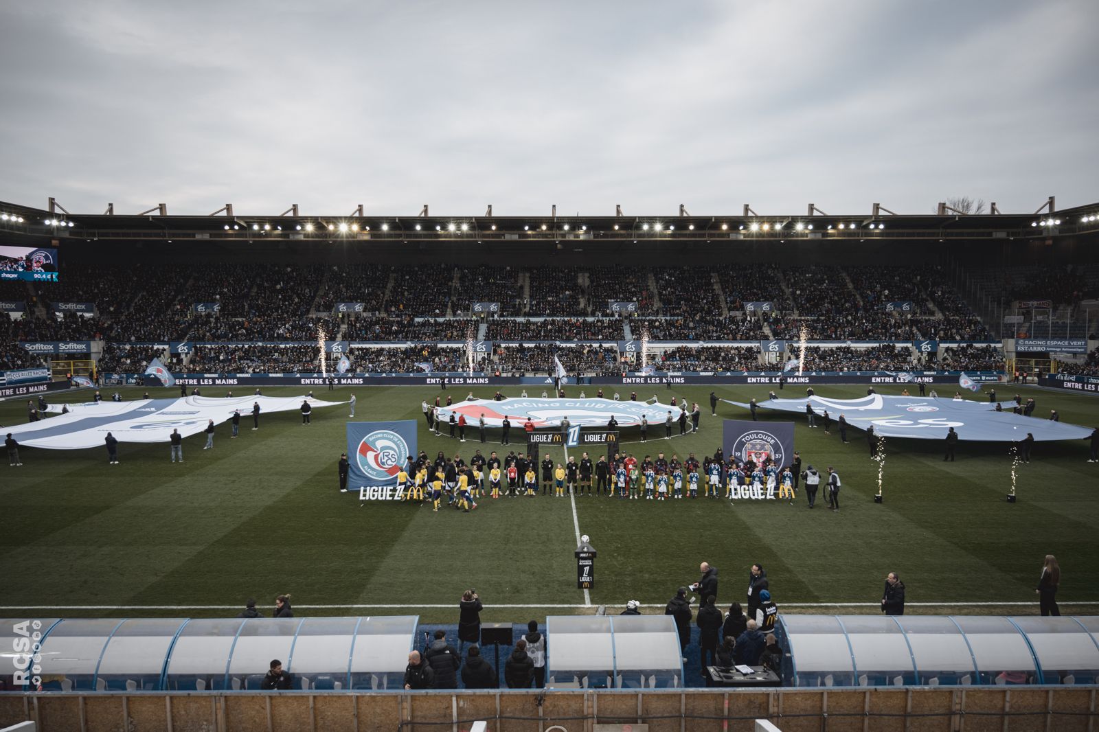 - Tifos centrales de campo para cubrir el círculo central o zonas específicas del terreno de juego antes del inicio del partido.